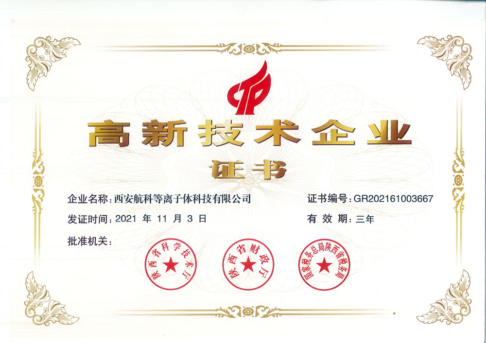 高新技術(shù)企業(yè)證書(shū)_高企證書(shū)_高新技術(shù)企業(yè)__西安航科等離子體科技有限公司
