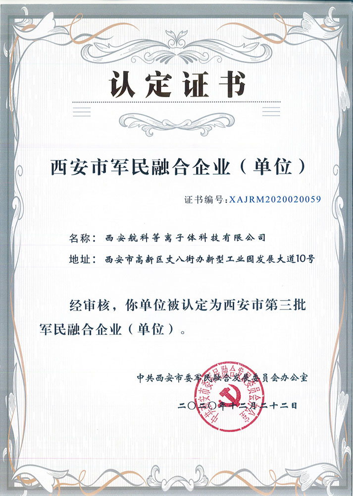 西安市軍民融合證書(shū)_軍民融合證書(shū)_軍民融合__西安航科等離子體科技有限公司